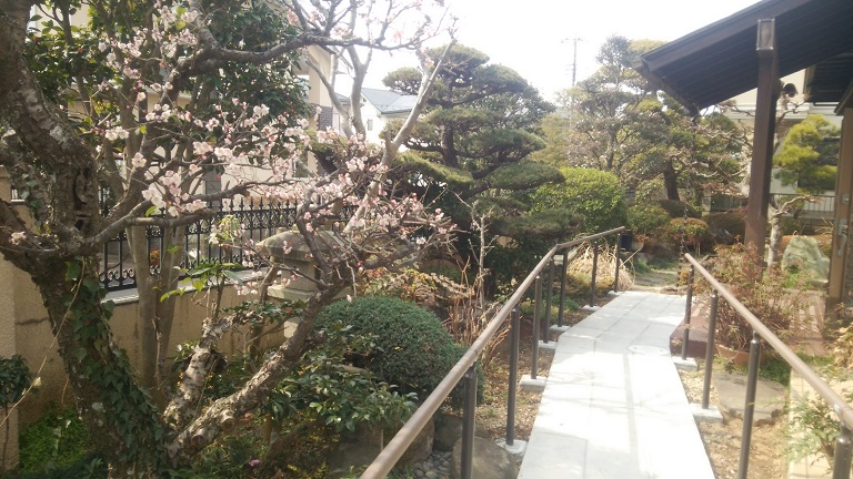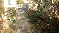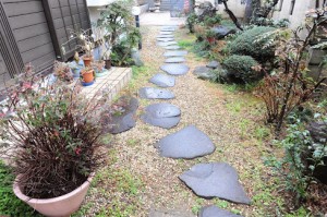 ●アプローチは飛び石から平石敷きと両脇に手摺を設置しました。